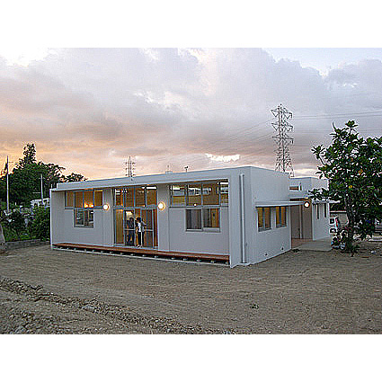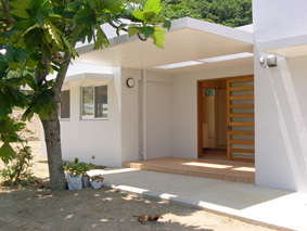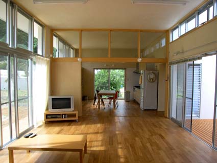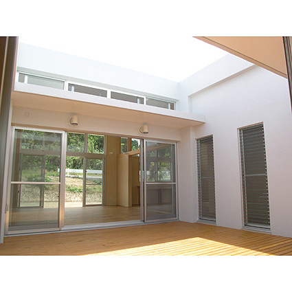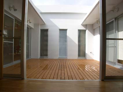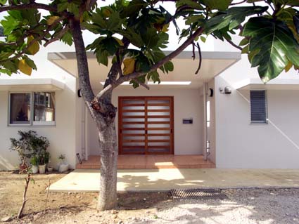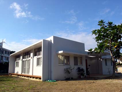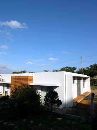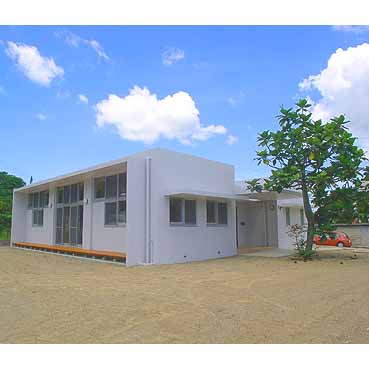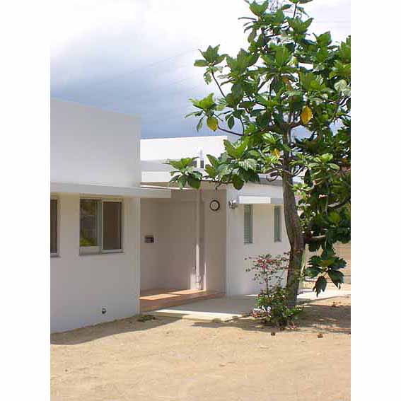 浦添の家 ■設計趣旨 「浦添の家」は、中央に木デッキの中庭を持つ、平屋の家です。 アプローチでは大きなパンの木の木陰が優しく迎えます。 二世帯住宅のこの建物は、東側の玄関を入ると正面に中庭が見え、右に行くと親世帯、左に行くと子世帯へと分れます。 その親と子が、中庭のデッキを挟んで、視覚的には繋がりつつ、適度な距離感を保っています。 子供達は、中庭のデッキを走り回り、大人達のまなざしに包まれ安心して生活できます。 天井高3.2mとした広くて大きな空間は、開口部を大きくとり、明るい空間となりました。 屋上に断熱ブロックを敷き込み、躯体へ熱を受けないように外断熱としました。 また、オペレーター付きの高窓を利用し、熱のこもらない風通しのよい室内環境が保てます。 「無印良品のように、シンプルで、ナチュラルな空間」という施主の要望から、壁・天井は漆喰塗り、床は無垢材のフローリング、と自然素材を用いました。自然素材により、視覚的にも、環境的にも、暮らす人々を優しく包み込んでいます。 |